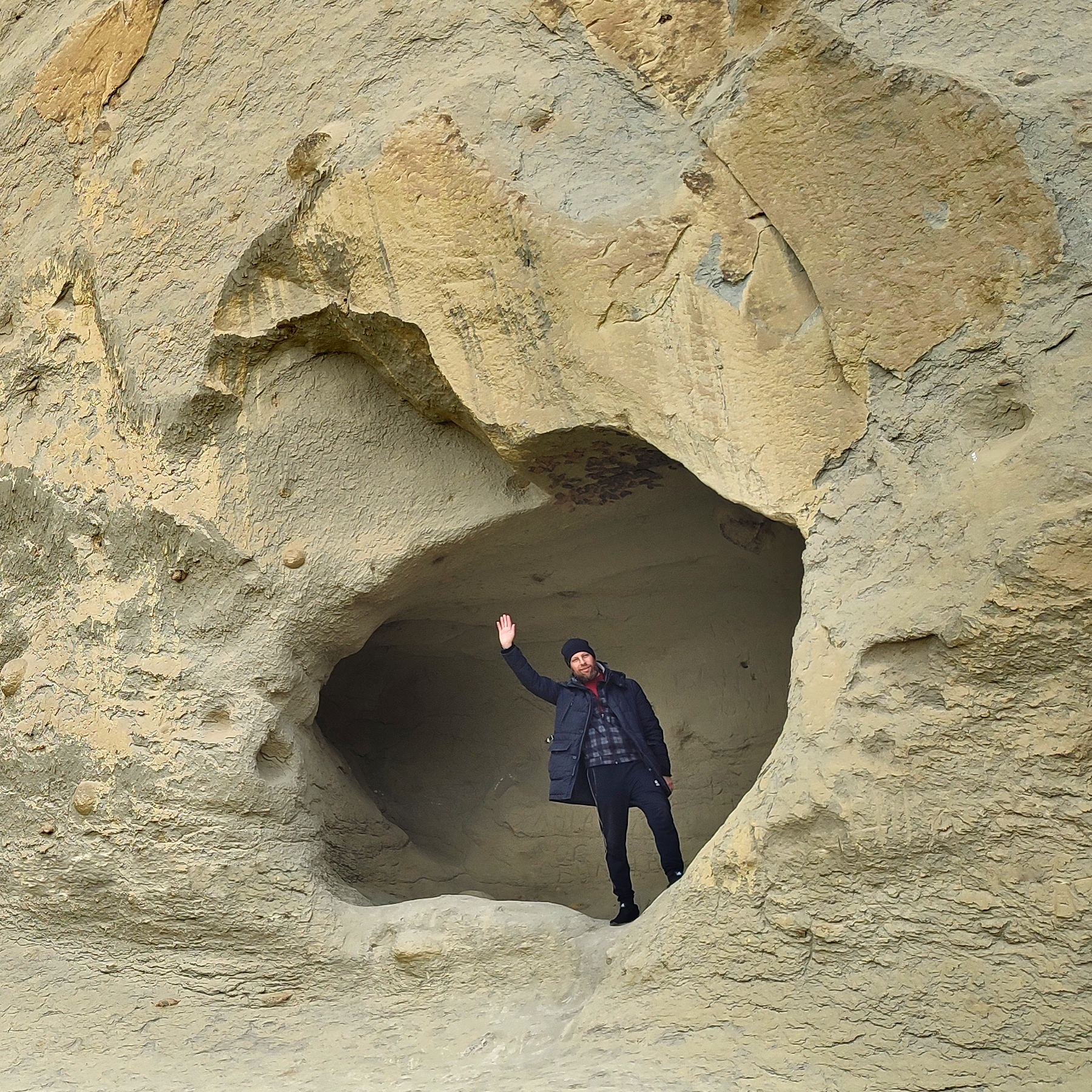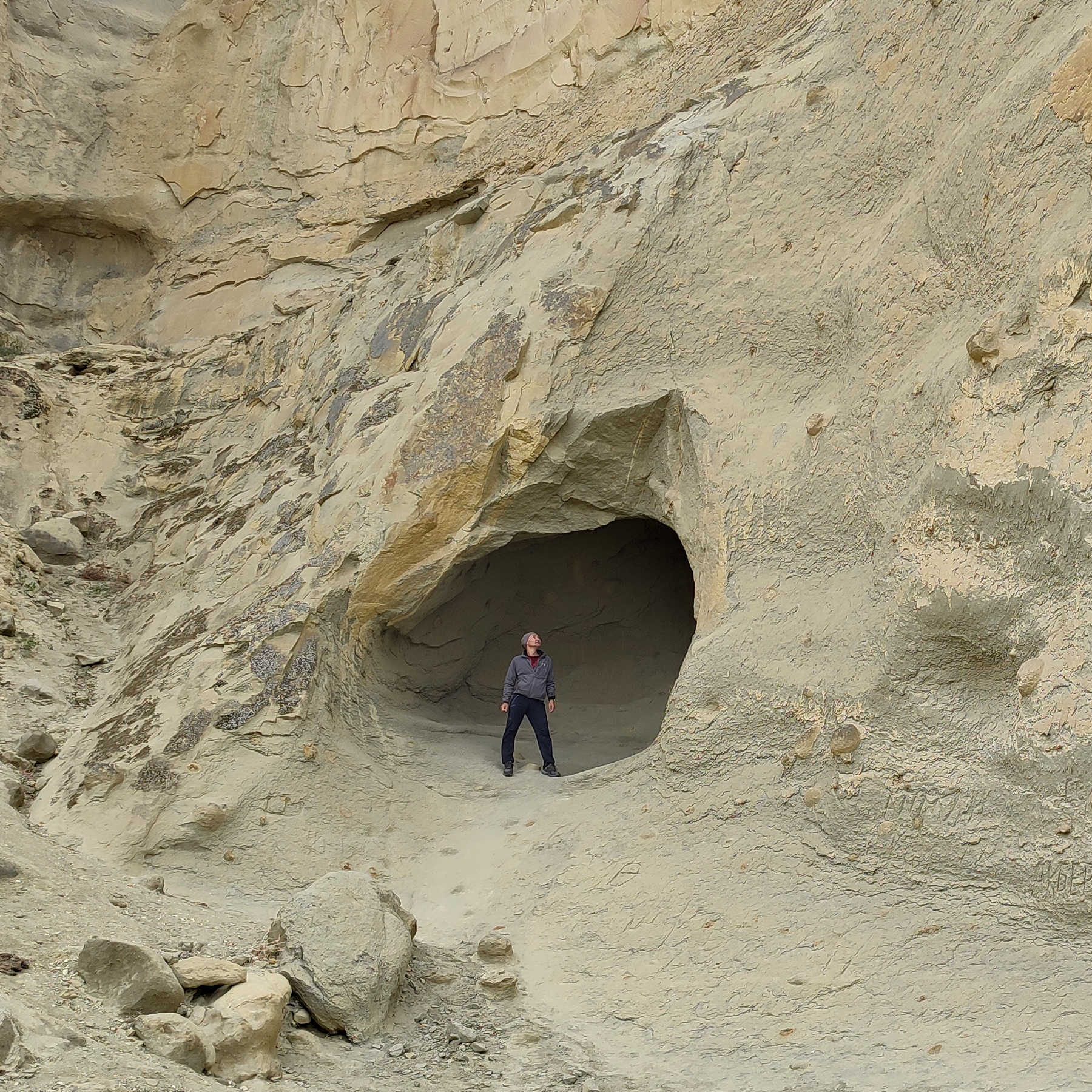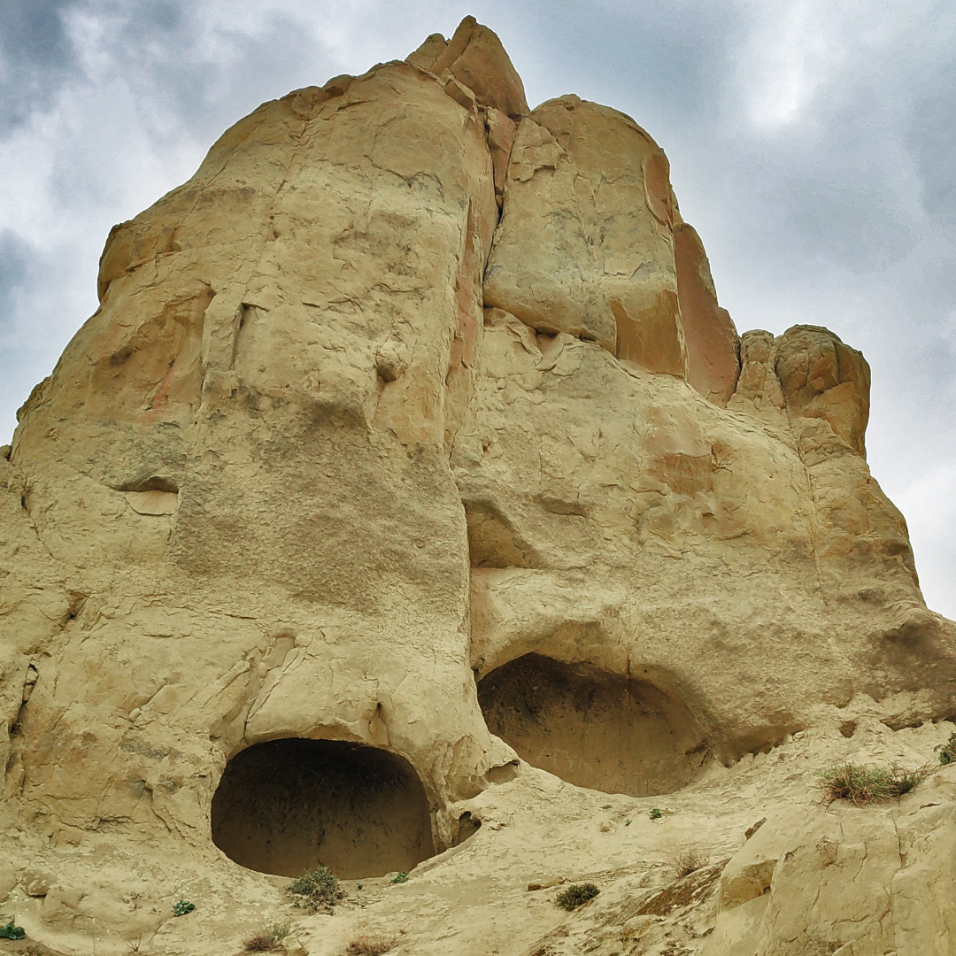 В стенах горы немало рукотворных выемок для облегчения подъёма и неглубоких пещер, вроде спальных мест. Порода относительно мягкая и при желании, довольно легко поддаётся для "творчества" человека.