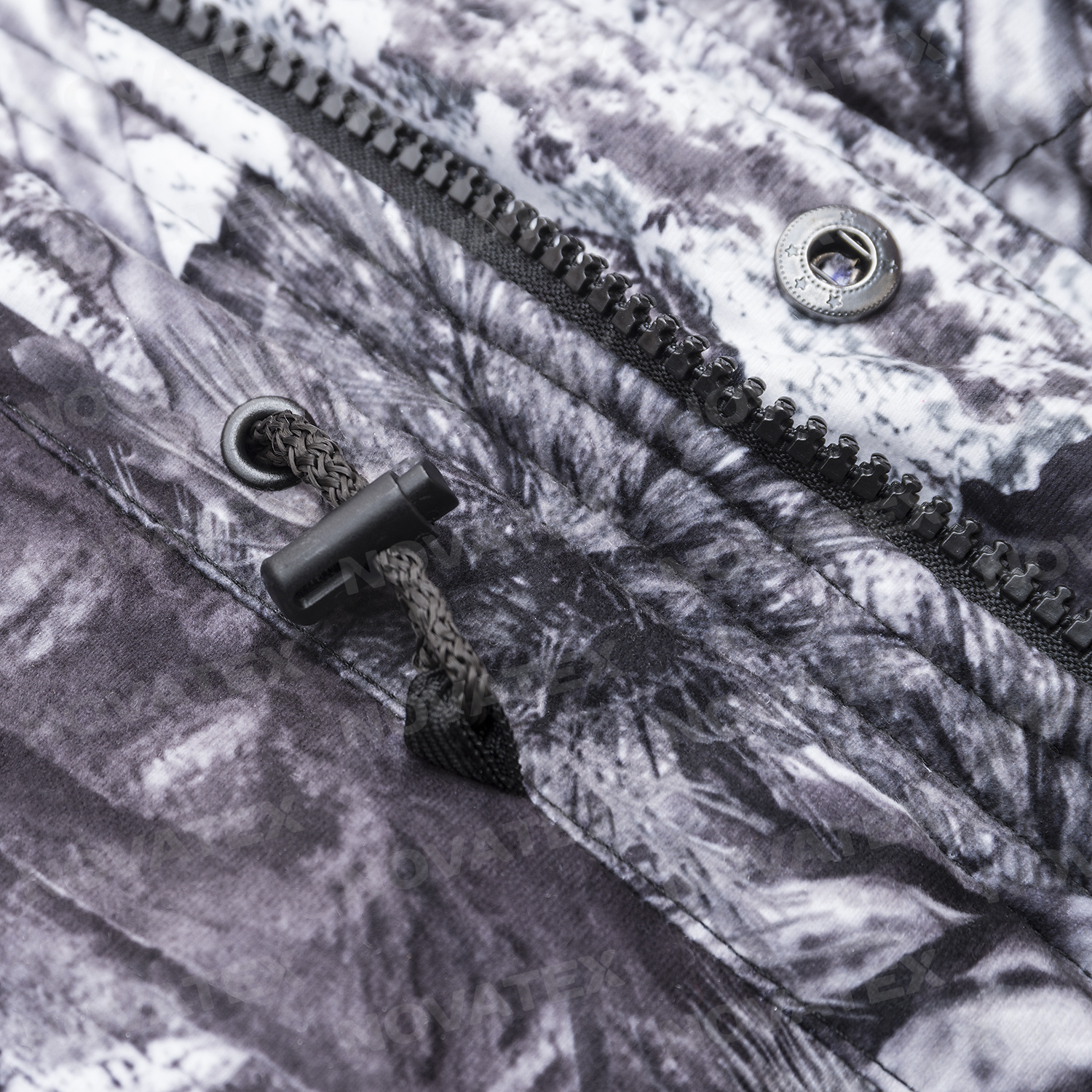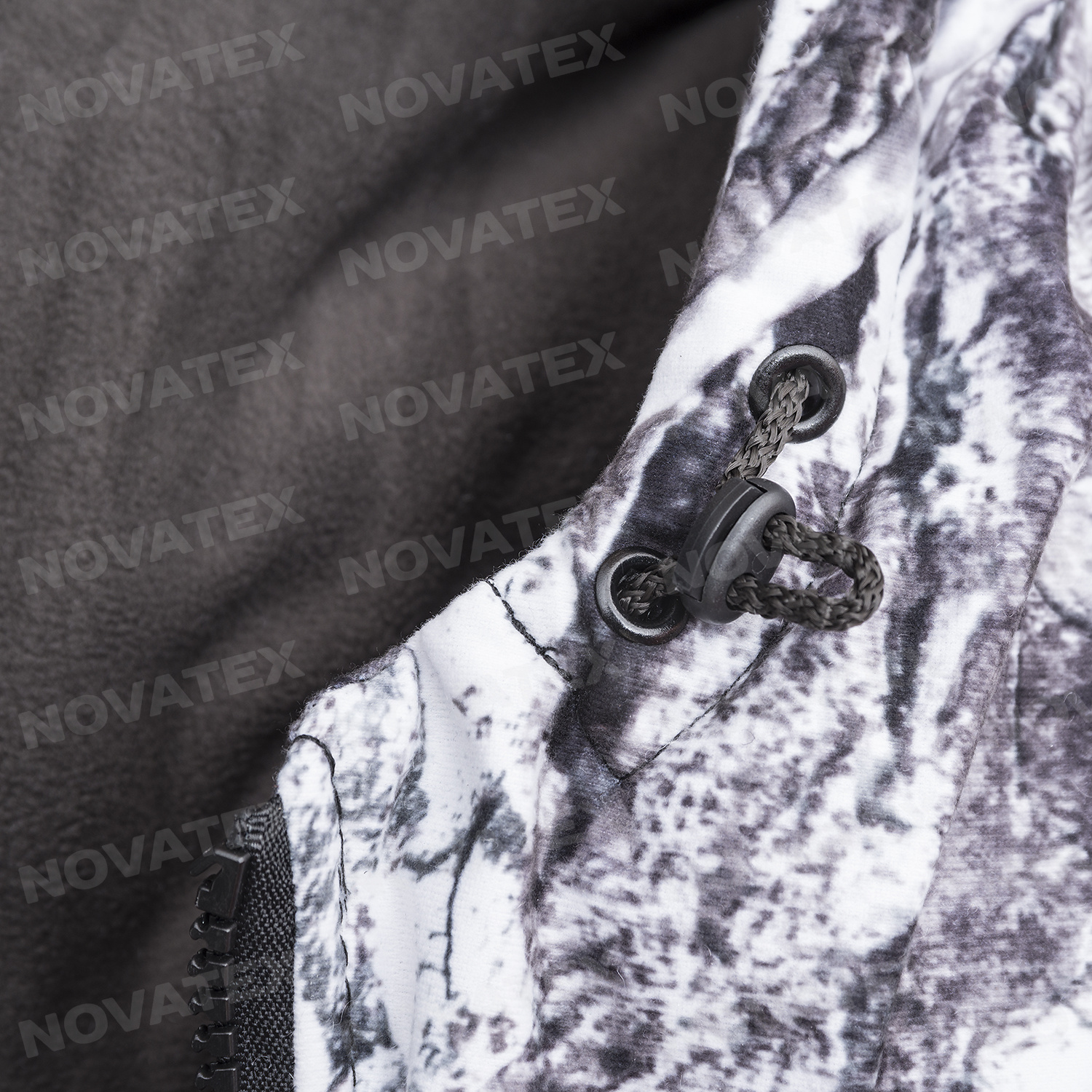 Ткань подклада: термофольга (тело куртки, ПЭ 100%, плотность 60 г/кв.м), таффета (полукомбинезон, рукава, 100% ПЭ, плотность 60 г/кв.м), флис (внутренняя часть воротника, 100% ПЭ, плотность 130 г/кв.м)